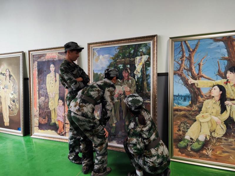 展览现场,军训教官与社团指导教师李怡函联合开设“油画中的国防教育课”。在《兵团记忆·芳华》前,教官指着画中的女知青向新生讲述“兵地融合”的深刻内涵;李怡函老师则引导学生观察画中军垦毡房与现代营房的建筑演变,解读新疆70年来的民生巨变。“原来军训时唱的《兵团进行曲》,歌词里‘戈壁滩上盖花园’的故事就藏在这些画里!”2025级学前教育专业新生袁文博感慨道。