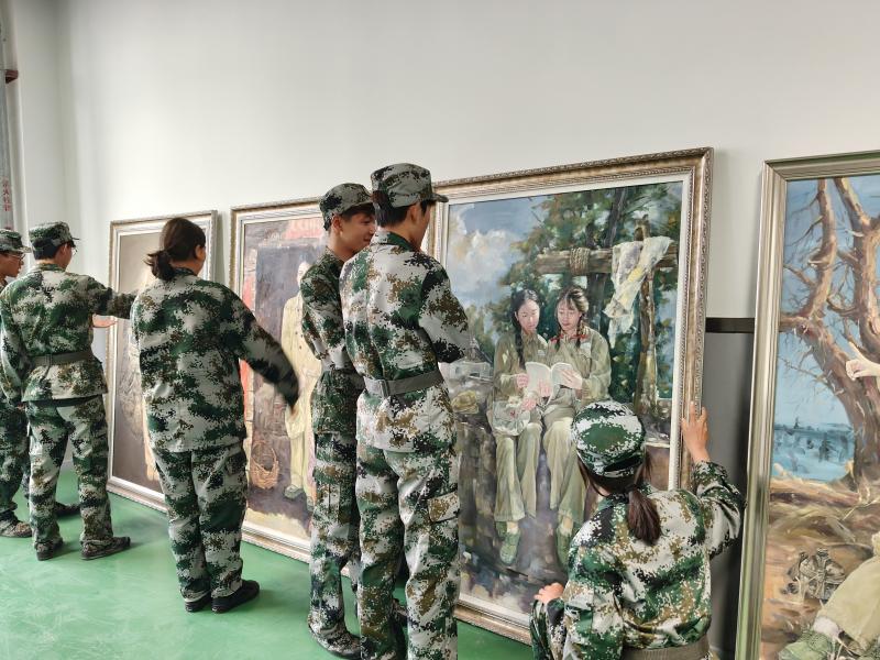 开幕式当天,50余名身着迷彩服的军训新生迈着整齐步伐,以方阵形式步入展厅。整齐的脚步声与画中军垦先辈的垦荒号子形成跨越时空的共鸣。