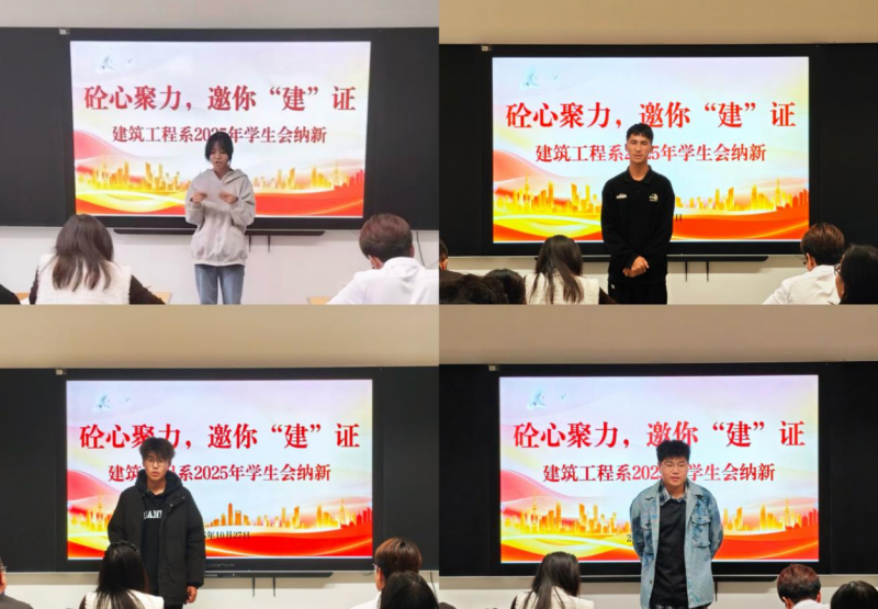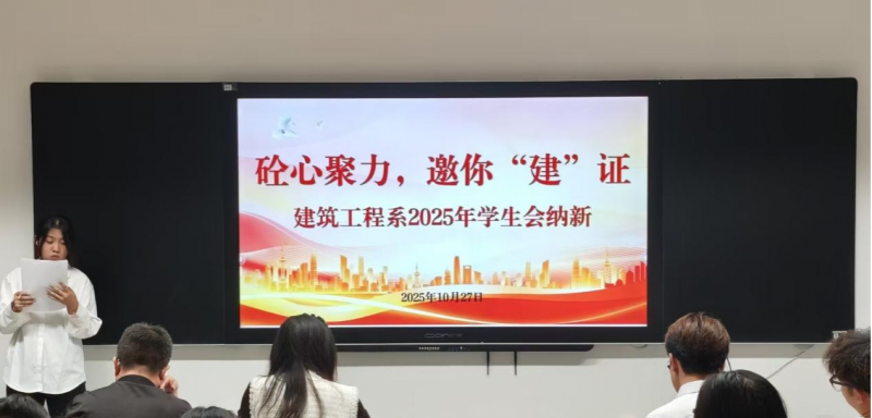 发言结束后,纳新工作正式开始。2025级新生依次登台,他们结合自身优势与职业规划,清晰阐述对学生会岗位的认知及对未来工作设想:有人分享建筑模型制作特长,期待为系内科技文化活动添砖加瓦;有人提及班级服务经验,希望在系学生会延续责任担当,充满真诚的表达赢得现场阵阵掌声。