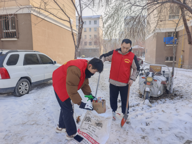 在社区服务中,李明凯同学身穿红色志愿马甲,与同伴并肩作战。他手持铁锹、夹子等工具,对淮安小区内的积雪、垃圾及卫生死角进行全面清理,铲除路面冰雪保障居民出行安全,清扫绿化带中的白色垃圾与枯枝败叶,让社区面貌焕然一新。同时,他积极参与社区安全排查,深入楼道检查线路隐患与消防设施,细致排查并及时反馈风险点,为筑牢社区安全防线贡献力量。