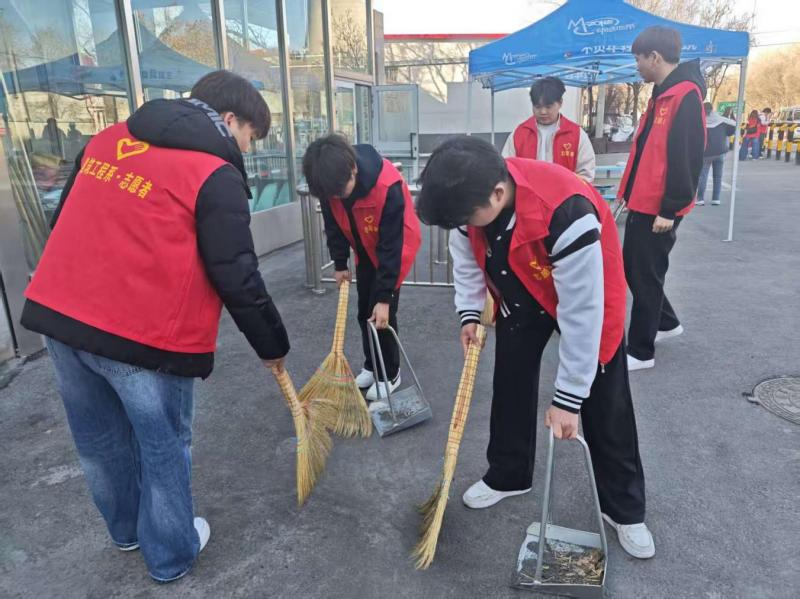 活动伊始,学子们身披鲜红的志愿马甲,手持扫帚、抹布、垃圾袋等清洁工具,精神饱满地奔赴校园大门及周边区域,迅速投入到清洁工作中。活动现场,大家分工协作、默契配合,有的俯身捡拾地面上的纸屑、烟头、塑料杂物;有的踮脚细致擦拭校园大门立柱、标识牌上的浮尘;有的弯腰清理角落缝隙中的卫生盲区。不放过每一处污渍、不遗漏每一个细节,用双手擦亮校园门户,用热忱守护校园环境的整洁与美观。