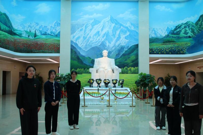 全体成员身着深色服装、佩戴团徽,在周恩来总理纪念碑前整齐列队,现场气氛庄严肃穆。团员们垂首肃立一分钟,深切缅怀周总理的丰功伟绩与崇高风范。优秀团员代表巴合疆·马哈苏特同学致追思词,号召大家以周恩来总理为楷模,勇担时代责任。团支书任娜羽同学带领全体团员重温入团誓词,铿锵誓言彰显了青年一代不忘初心、砥砺前行的坚定信念。